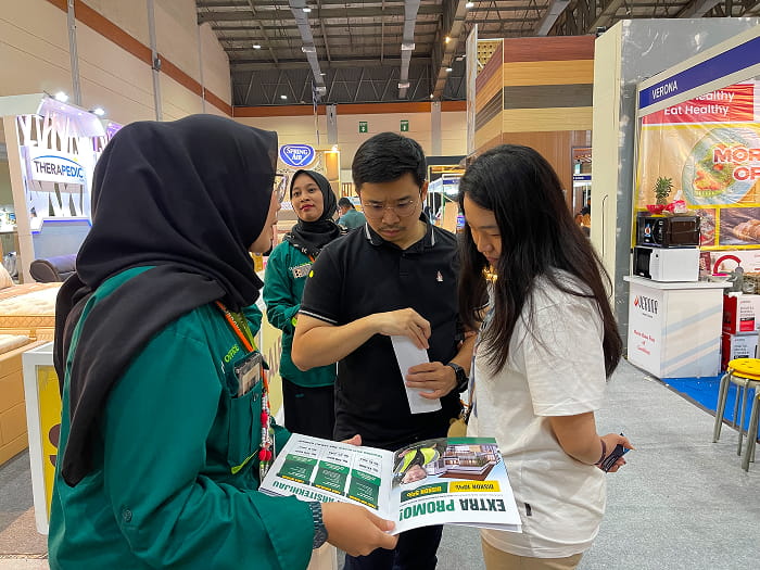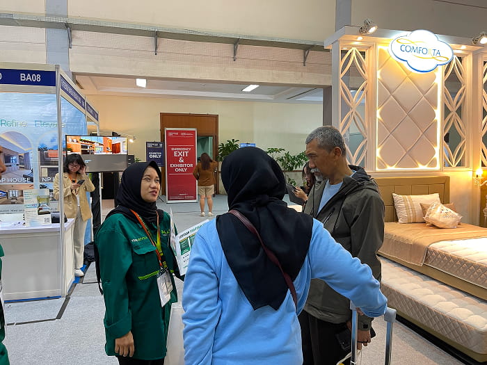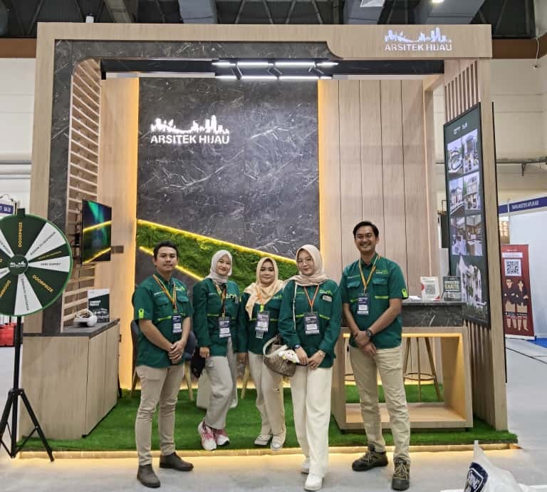 Pengunjung yang melewati area pameran banyak berhenti karena tertarik dengan tampilan booth yang memadukan material kayu, aksen hijau, dan lighting yang elegan. Tidak hanya desain booth-nya, tetapi portofolio proyek hunian dan interior yang ditampilkan di layar digital juga menjadi magnet bagi para pengunjung. Banyak yang ingin mengetahui lebih jauh bagaimana Arsitek Hijau merancang rumah yang indah, fungsional, serta berkelanjutan.